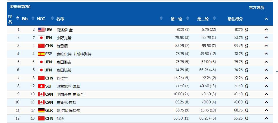 资格赛分两轮进行,取选手最好成绩排名,前12名进入决赛。