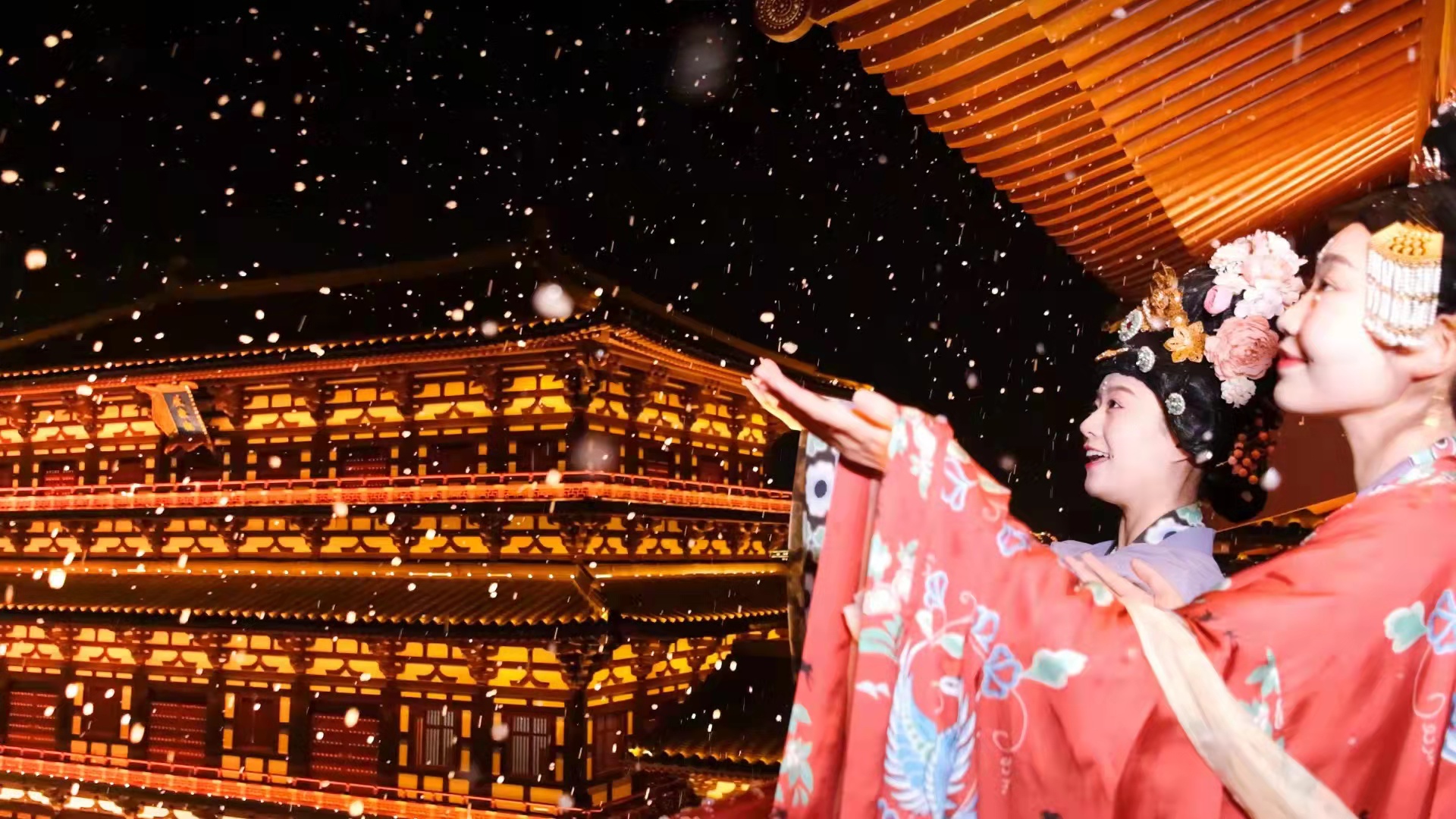 隋唐洛阳城推出“国风隋唐上元节”活动,身着汉服的游客登上应天门阙楼,观万盏明灯,赏古都“雪景”。隋唐洛阳城供图
