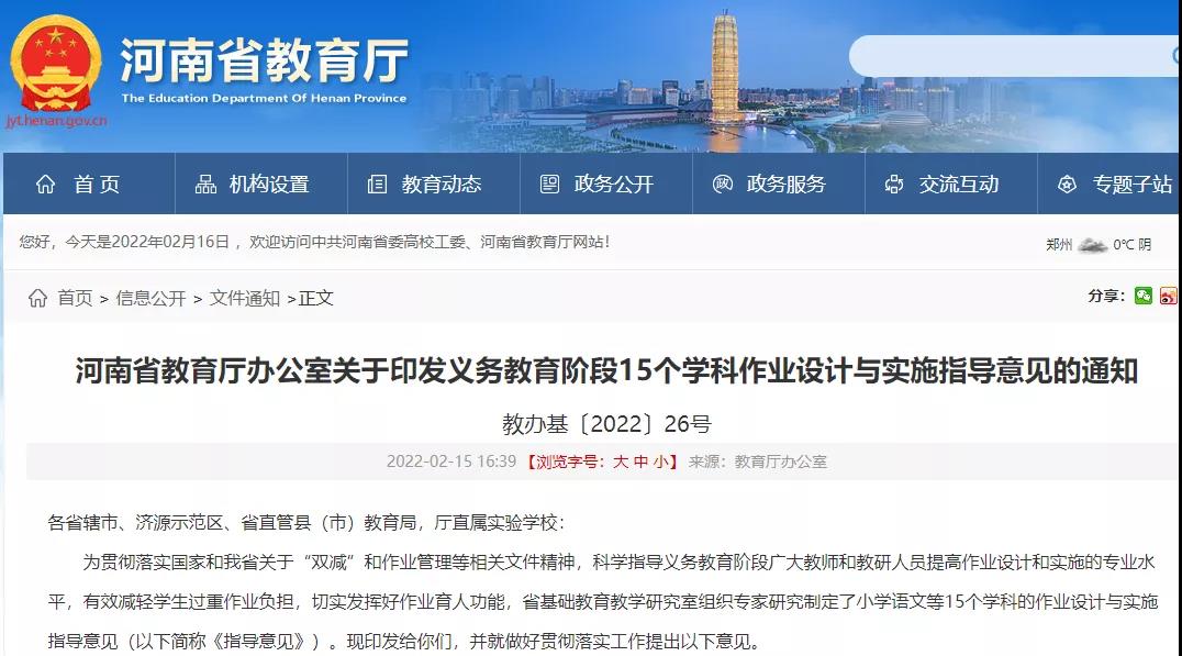 “双减”政策下,义务教育阶段15个学科作业怎么管?如何设计?2022年春季开学之际,省教育厅印发《关于印发义务教育阶段15个学科作业设计与实施指导意见的通知》,贯彻落实国家和我省关于“双减”和作业管理等相关文件精神。