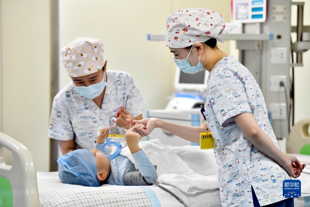 在山东省枣庄市妇幼保健院儿童ICU病房,医护人员为完成靶向治疗药物诺西那生钠的4岁脊髓性肌萎缩症患儿加油鼓劲(1月1日摄)。诺西那生钠注射液是我国首个获批治疗脊髓性肌萎缩症的进口药物,2019年进入中国市场时,每针价格近70万元。在2021年国家医保目录药品谈判中,以3.3万元每针的价格进入新版医保药品目录。新华社记者 郭绪雷 摄