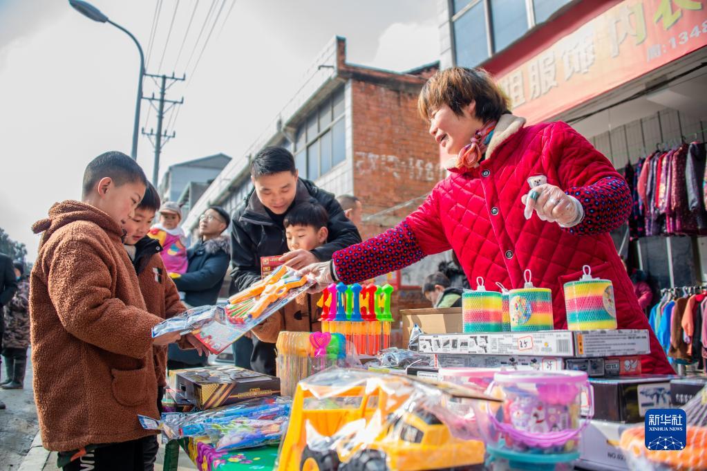 1月29日,小朋友在湖北省随县柳林镇街头的一个玩具摊前选购玩具。新华社发(伍志尊 摄)