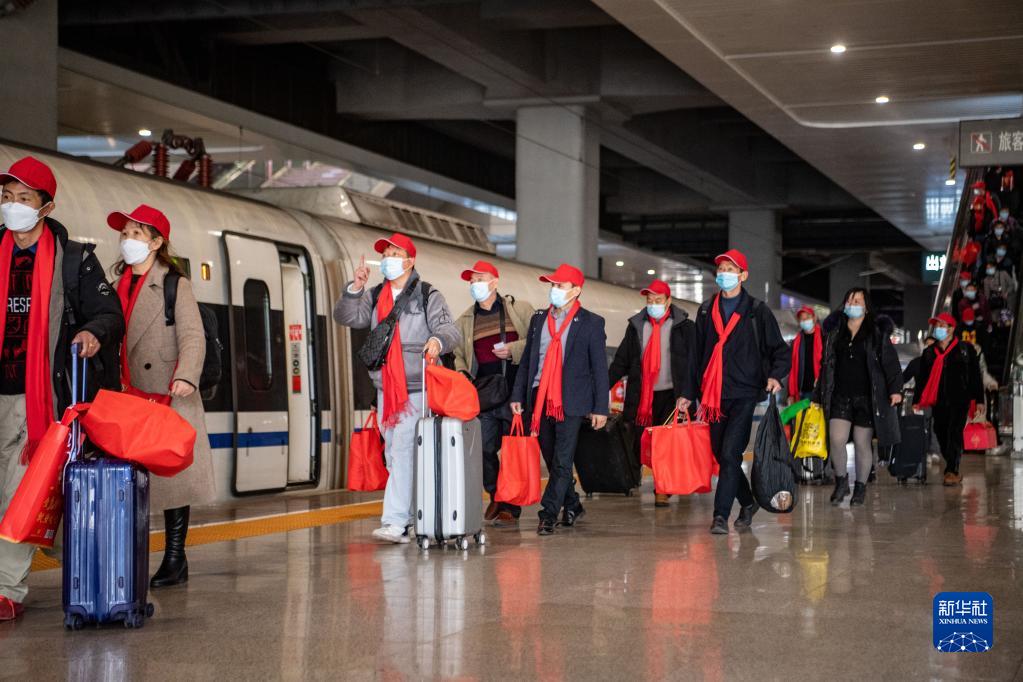 2月16日,返岗务工人员在重庆西站乘车。新华社记者 唐奕 摄