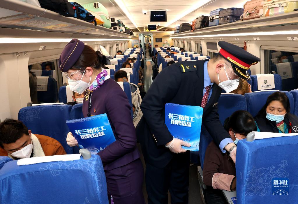 2月12日,列车乘务员在重庆开往上海的G1334次列车上,向春运返程务工人员发放招聘信息。新华社记者 陈飞 摄