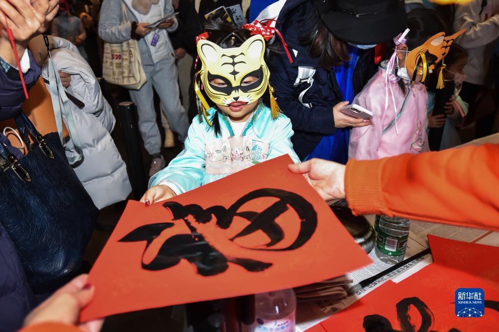 2月15日,在清华大学艺术博物馆元宵节夜场活动上,佩戴虎头面具的小朋友领取现场书写的“福”字。新华社记者 陈钟昊 摄