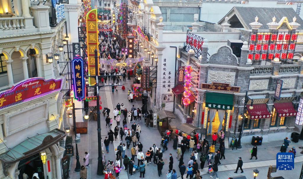 2月5日,游客在河南郑州建业·华谊兄弟电影小镇游览(无人机照片)。新华社记者 张浩然 摄