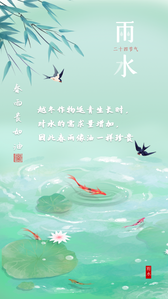 比如冬小麦,在返青生长时对水的需求量就明显增加,因此春雨像油一样珍贵。类似的谚语还有“雨水有雨庄稼好,大春小春一片宝”“蓄水如囤粮,水足粮满仓”等。