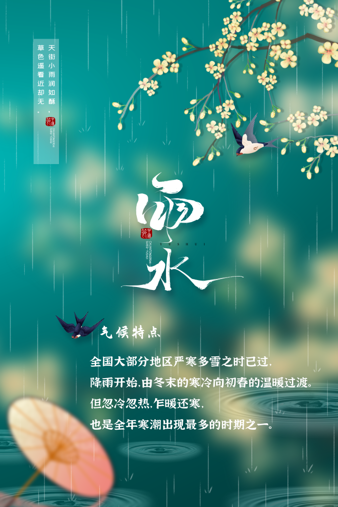 雨水到来后,我国大部分地区气温回升到0摄氏度以上,黄淮平原日均温达到约3摄氏度,江南约5摄氏度。但这时大气环流处于调整阶段,忽冷忽热,乍暖还寒,也是全年寒潮出现最多的时期之一。