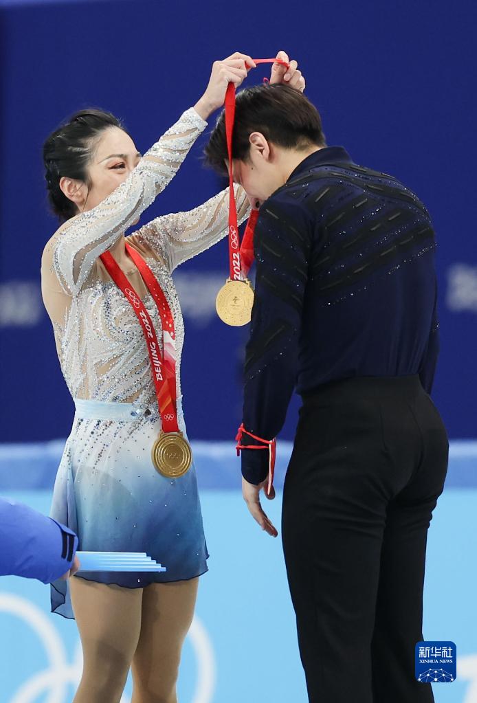 2月19日,中国选手隋文静(左)在奖牌颁发仪式上为队友韩聪戴上金牌。