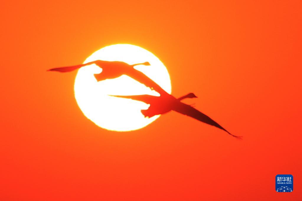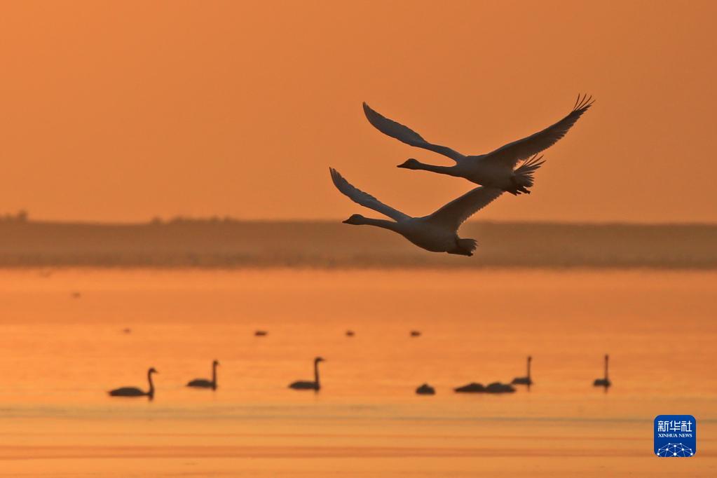 2月24日清晨,在山东荣成天鹅湖畔,一群大天鹅映着日出飞翔。