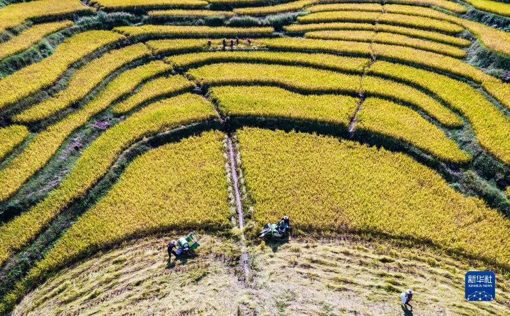 2021年9月21日,湖北省秭归县沙镇溪镇村民在田间收获高山冷水稻(无人机照片)。新华社发(向红梅 摄)