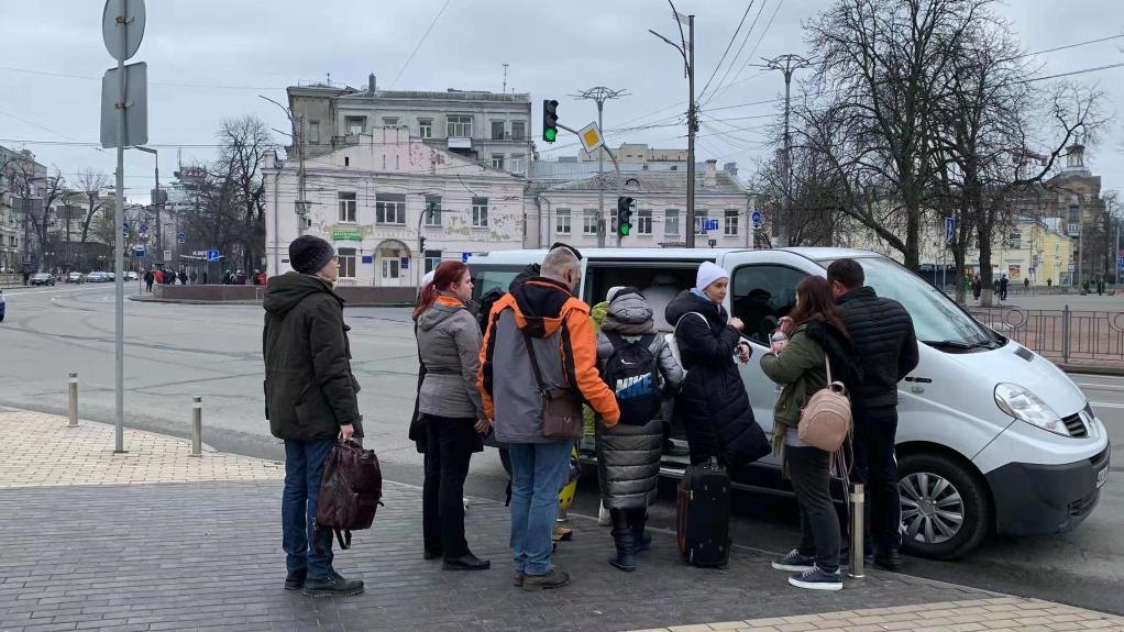 2月25日,人们在乌克兰基辅街头乘车,准备离开基辅。新华社记者鲁金博摄