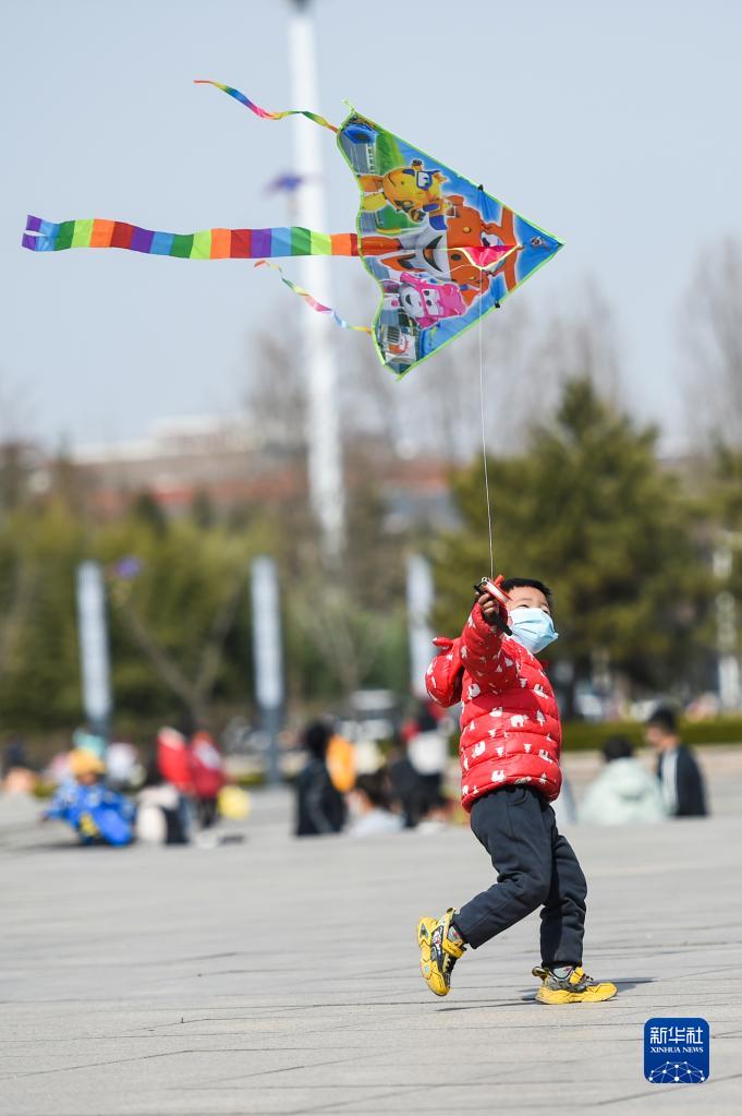3月6日,一名小朋友在山东省青州市东夷文化标志园广场放风筝。