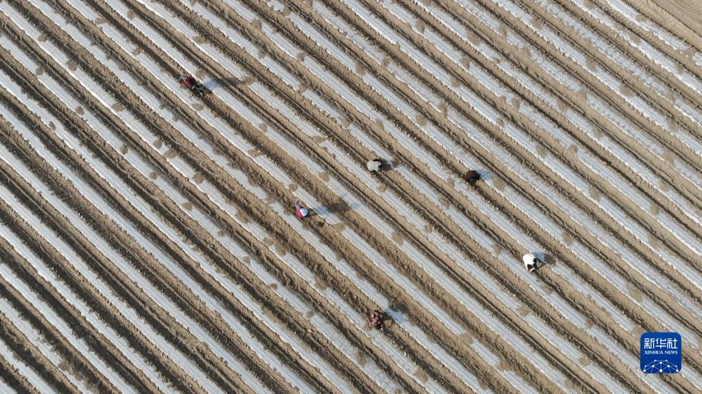 3月8日,河北省邢台市南和区河郭镇辛庄村农民在田间劳作(无人机照片)。 张驰 摄
