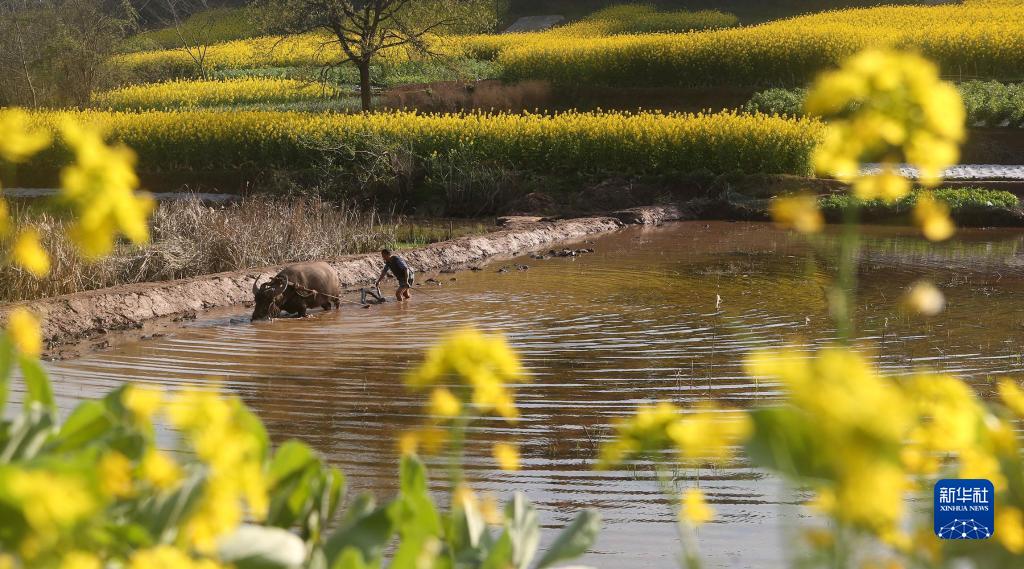 3月7日,四川省内江市东兴区白合镇的农民在油菜花飘香的田间翻耕农田。兰自涛 摄