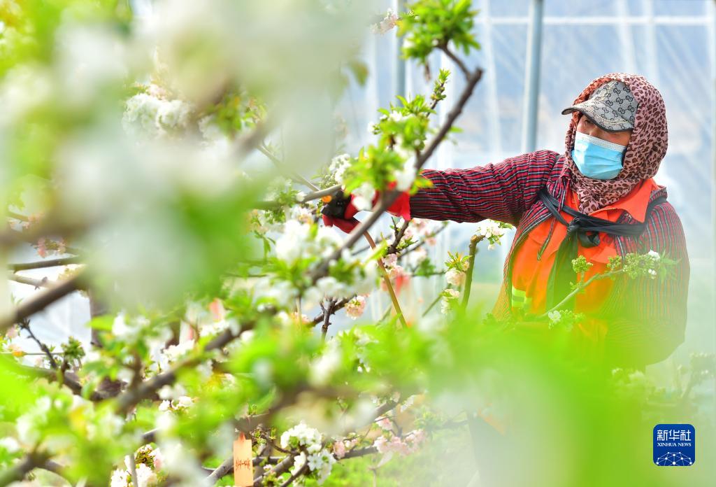 3月9日,在河北省石家庄市鹿泉区山尹村镇的樱桃种植基地,当地农民进行樱桃花授粉。张晓峰 摄
