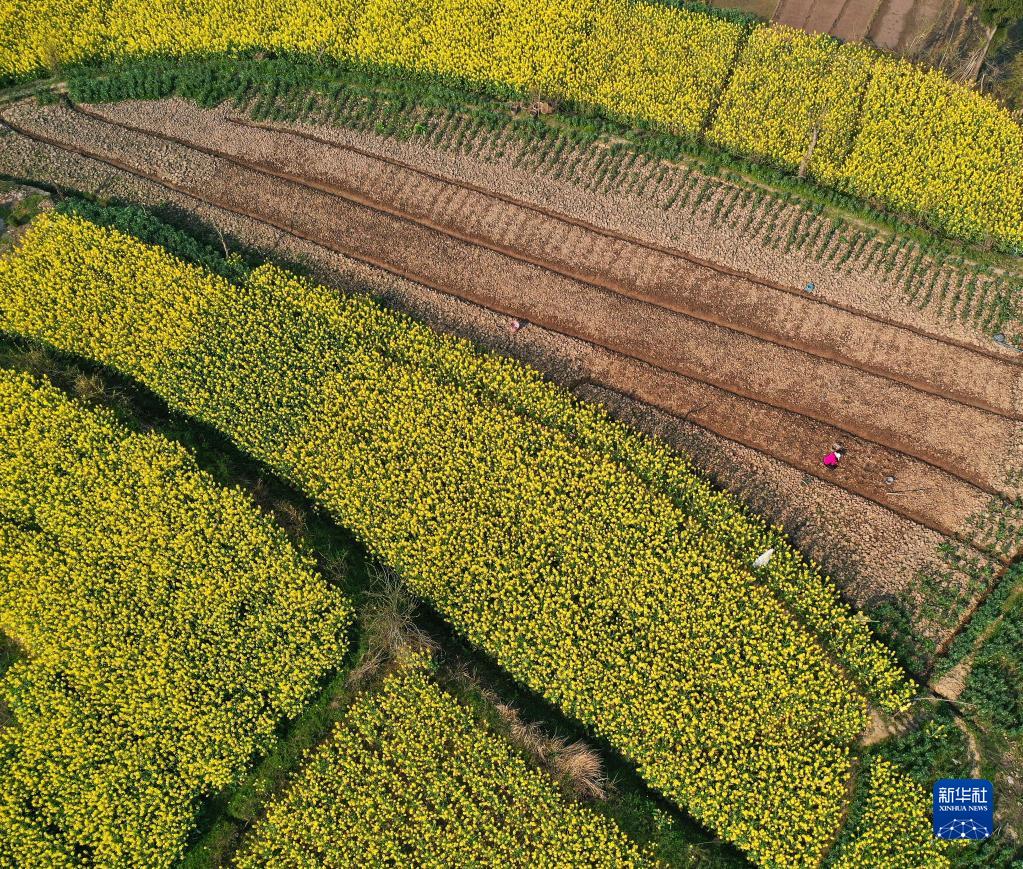 3月9日,在四川省南充市蓬安县睦坝镇武胜村,村民在田间劳作(无人机照片)。刘永红 摄