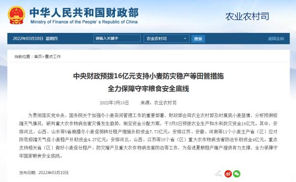 据财政部网站消息,近日,中央财政预拨16亿元支持小麦防灾稳产等田管措施,全力保障守牢粮食安全底线。