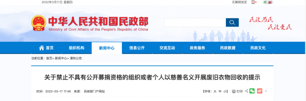 据民政部网站消息,民政部慈善事业促进和社会工作司3月17日发布《关于禁止不具有公开募捐资格的组织或者个人以慈善名义开展废旧衣物回收的提示》称,为慈善目的,在公共场所设置废旧衣物募捐箱,属于公开募捐活动。根据慈善法的规定,只有具有公开募捐资格的慈善组织才能开展公开募捐活动。其他组织或者个人,不得开展公开募捐活动。