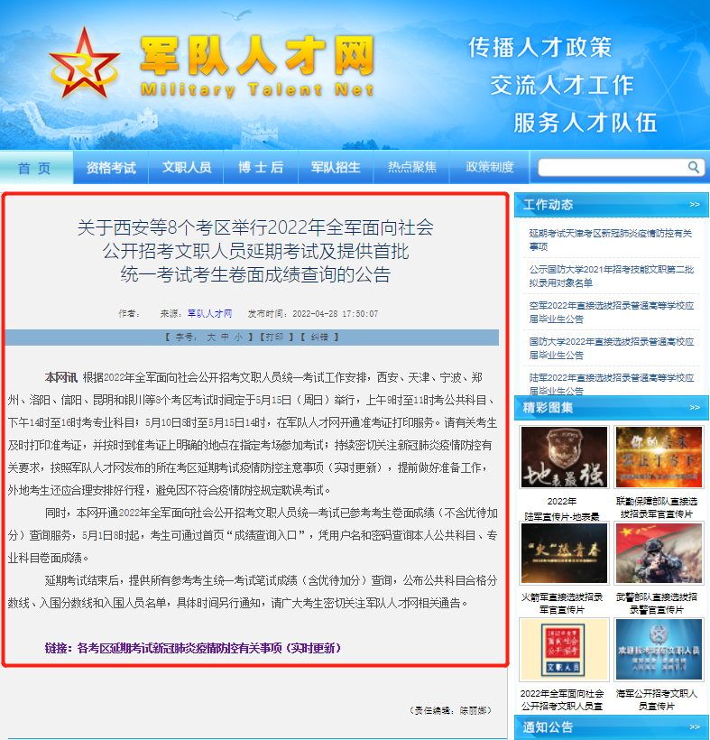 同时,军队人才网开通2022年全军面向社会公开招考文职人员统一考试已参考考生卷面成绩(不含优待加分)查询服务,5月1日8时起,考生可通过首页“成绩查询入口”,凭用户名和密码查询本人公共科目、专业科目卷面成绩。