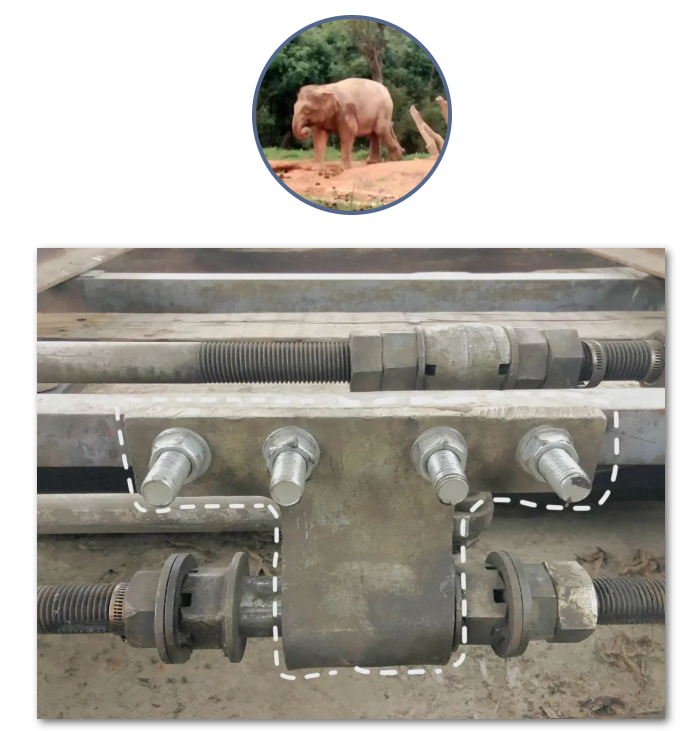 轴套连接件的连接部分俗称“象鼻铁”,呈“丁”字型,上端固定在道岔拉杆上,下端卷曲,像大象鼻子卷甘蔗一样牢牢“卷”在动作杆上,轴套两侧形成合力,能使动作杆顺利咬合。