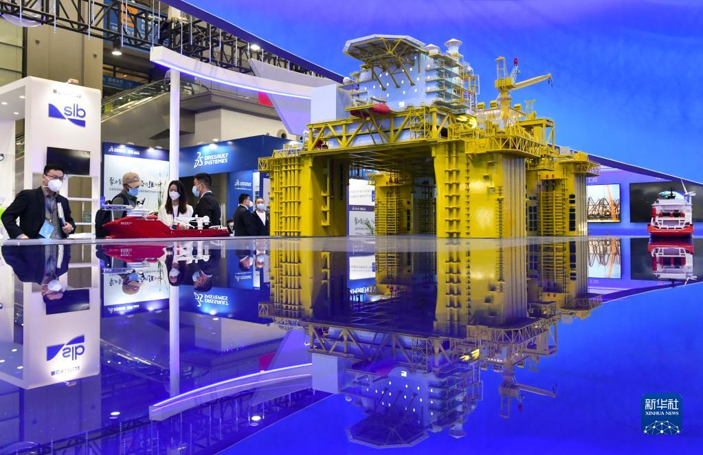 11月24日,观众在海博会现场观看中国海油“深海一号”模型。