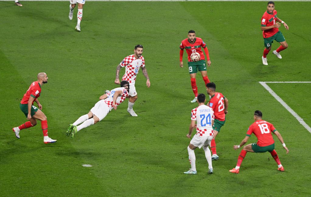 莫德里奇第24分钟在禁区前沿左脚远射,摩洛哥队门将布努将球扑出并赶在克罗地亚队球员补射前将球捅出危险区域。第42分钟,克罗地亚队再度领先,奥尔西奇禁区左侧一记漂亮的弧线球击中门柱后入网。