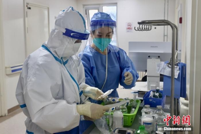 资料图:一名从山东来京支援的护士(左)在协助配置药品。 中新社记者 易海菲 摄