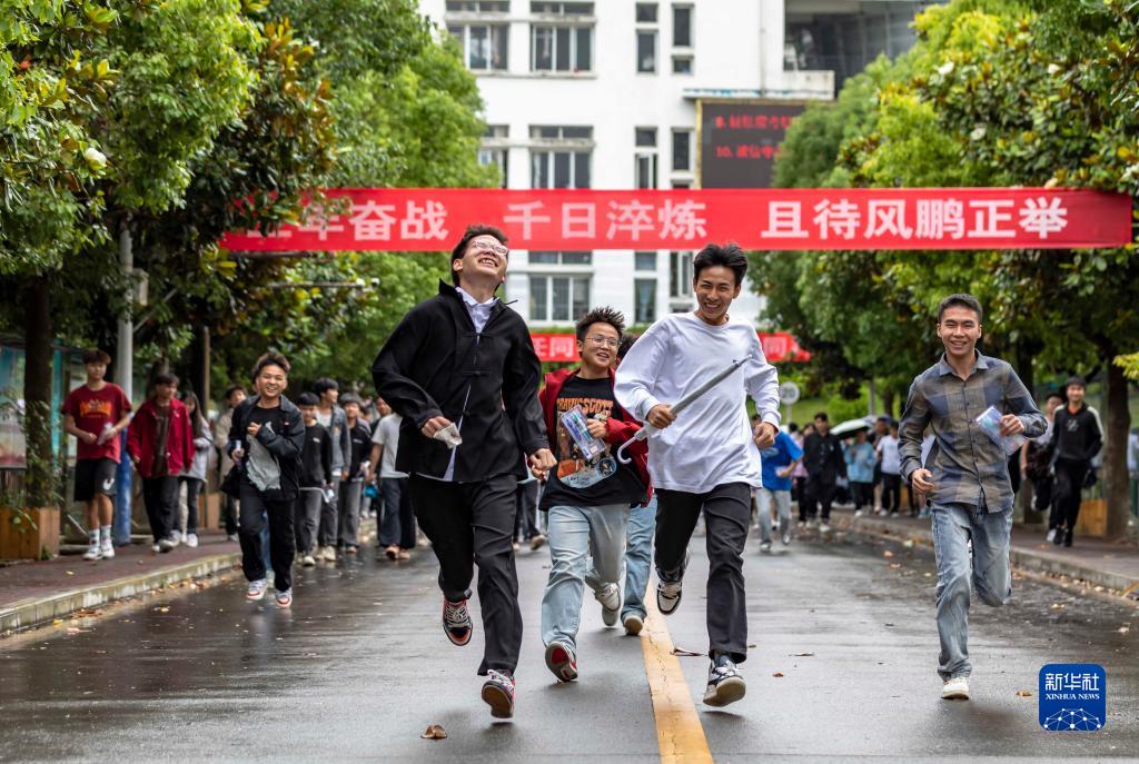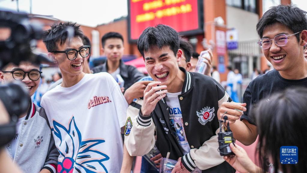 6月8日,在贵阳市乌当中学考点,考生结束考试后在考场外庆祝。