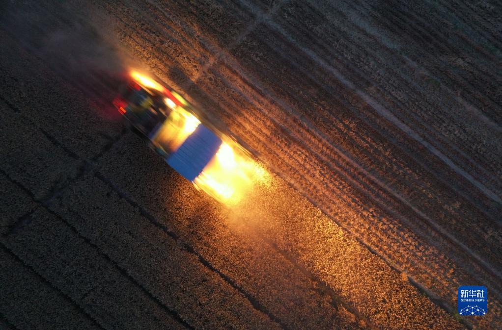 6月7日晚,收割机在袁营村抢收(无人机照片)。