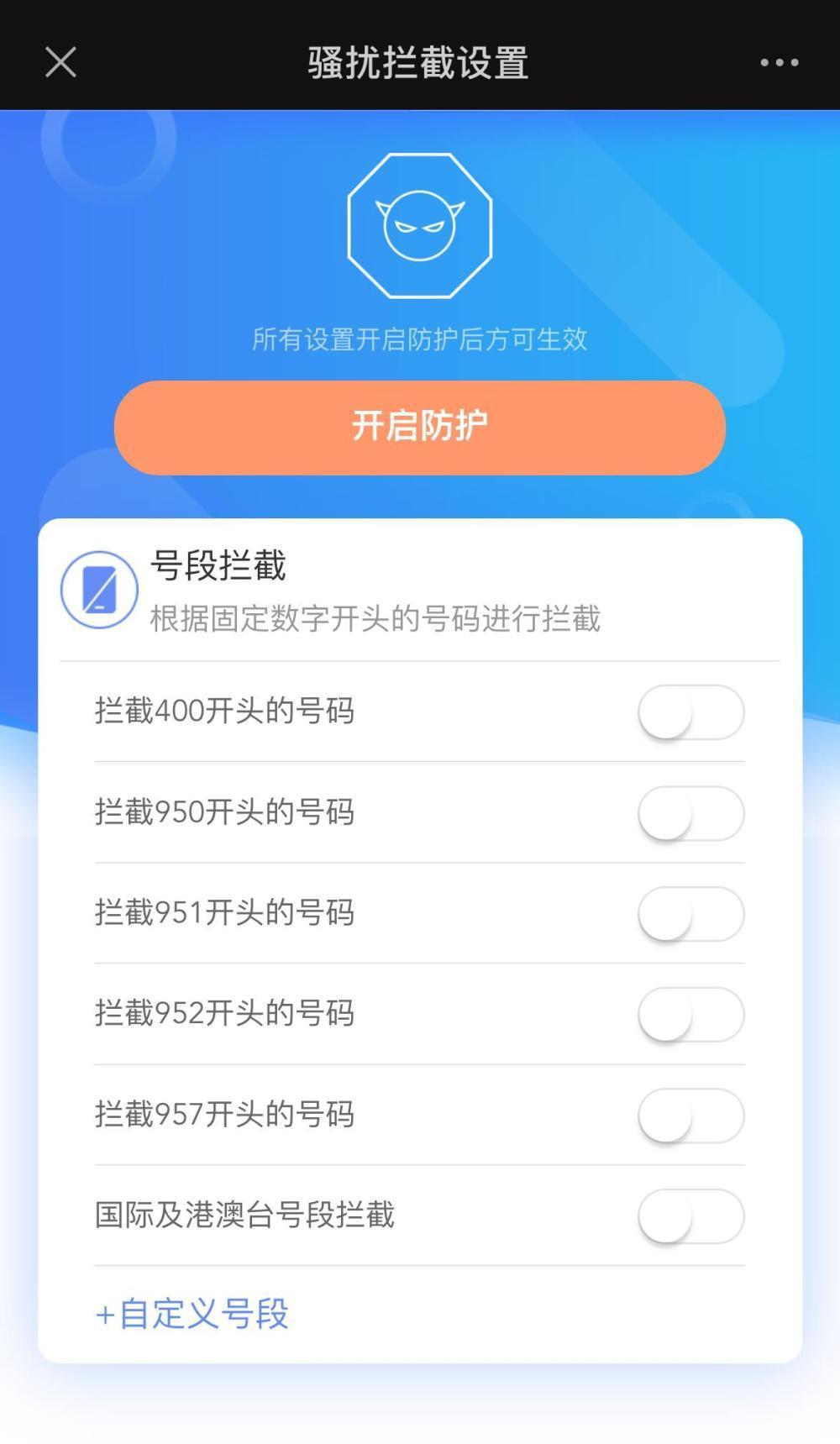 在“中国移动高频骚扰电话防护”微信公众号上,用户可以选定精准号段拦截,如拦截400、950、951等开头的号码,以及拦截国际及港澳台号段。如果有个性化需求,市民也能自定义设置需要拦截的号段。