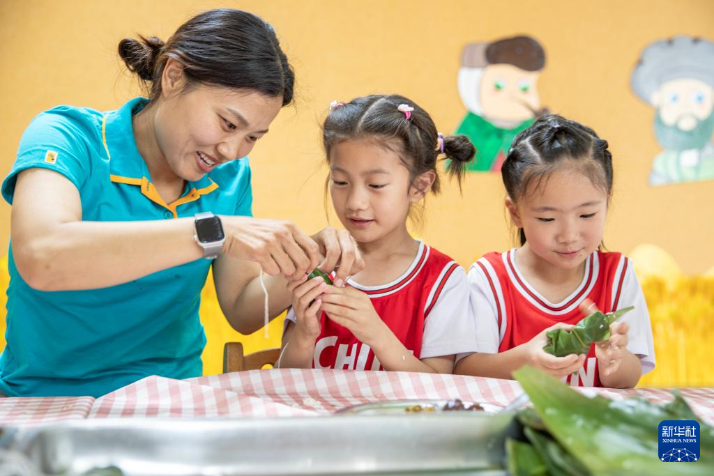 6月4日,在江苏省海安市南屏小学,一名家长在指导小学生包粽子。
