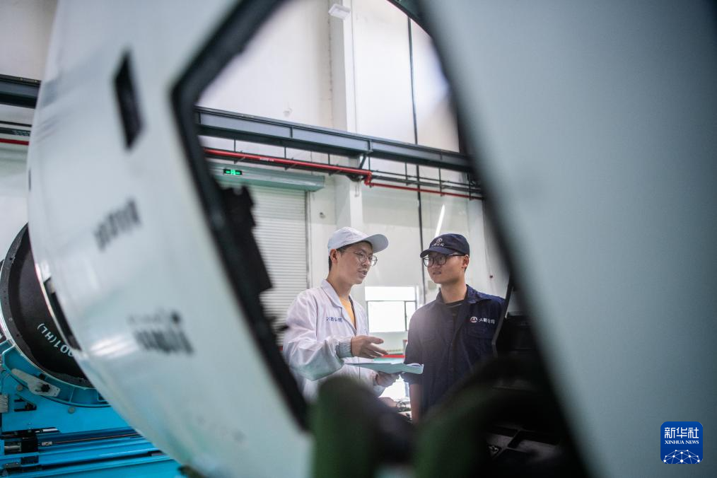 6月3日,航天科工火箭技术有限公司快舟火箭结构设计师刘家欣(左)与装配人员确认火箭舱段产品装配情况。今年29岁的刘家欣是航天科工火箭技术有限公司结构与地面设备研究室主任助理、主管设计师,参加过5次快舟火箭履约任务和多项型号设计优化工作,其牵头设计完成的快舟火箭新型复合材料星箭适配器已在多次快舟一号甲火箭发射履约任务中成功应用。