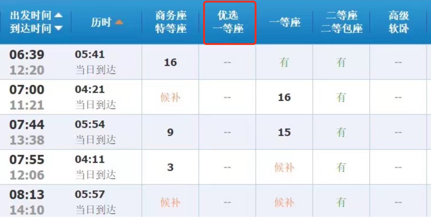 哪些列车上会有“优选一等座”?客服告诉澎湃新闻记者,并不是所有车型都有,目前只有复兴号和智能号会有,“乘客如有需要,可以根据出发地、目的地搜索一下,看哪些列车提供这个(优选一等座)。”