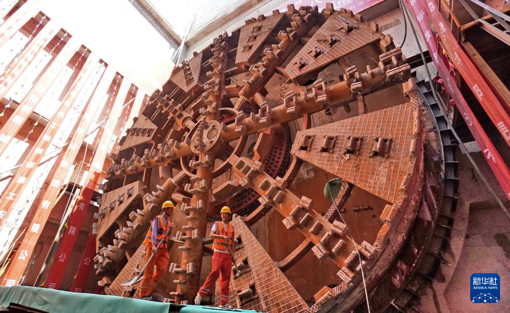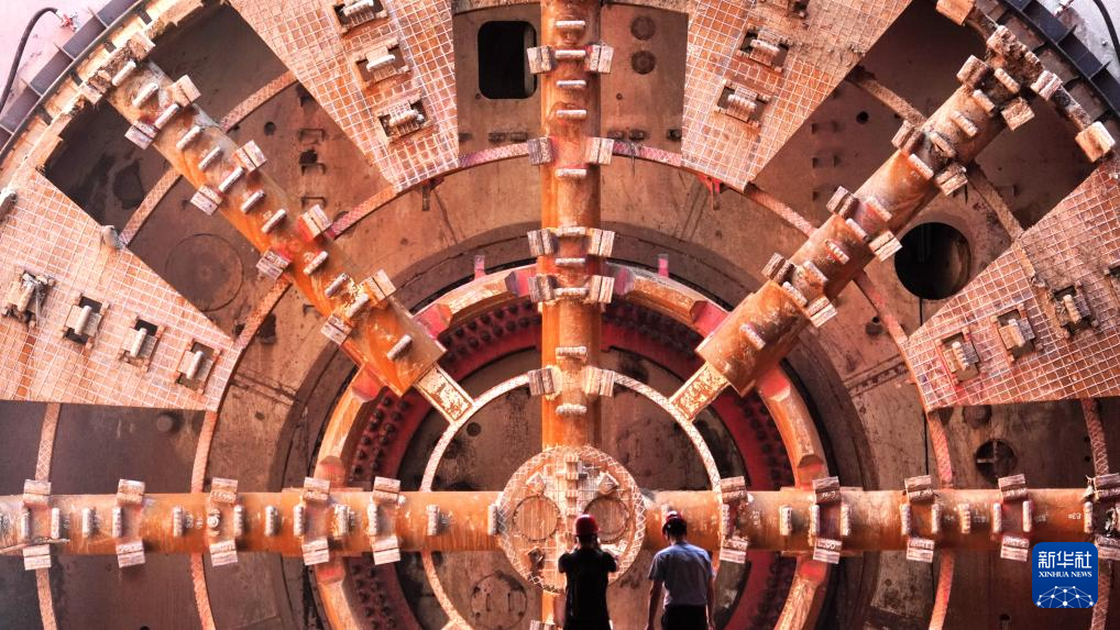 6月25日,工人从国产超大泥水平衡盾构机“京通号”前走过。
