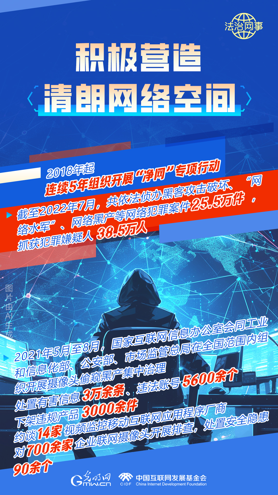 2018年起,连续5年组织开展“净网”专项行动。截至2022年7月,共依法侦办黑客攻击破坏、“网络水军”、网络黑产等网络犯罪案件25.5万件,抓获犯罪嫌疑人38.5万人。