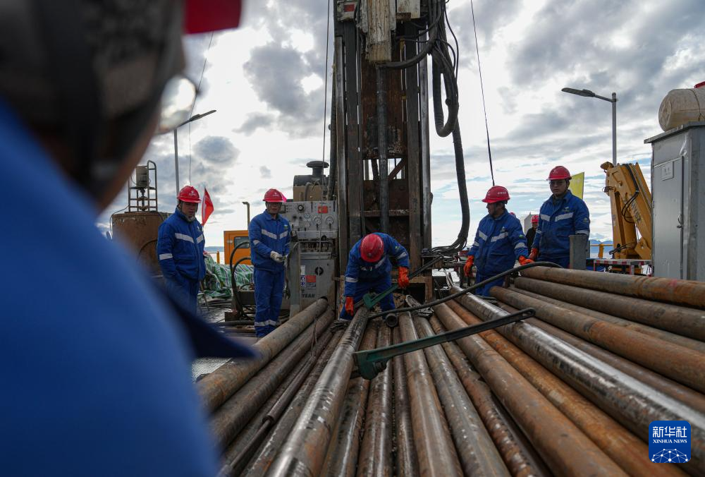 7月11日,钻探队队员在准备增加孔内钻杆。
