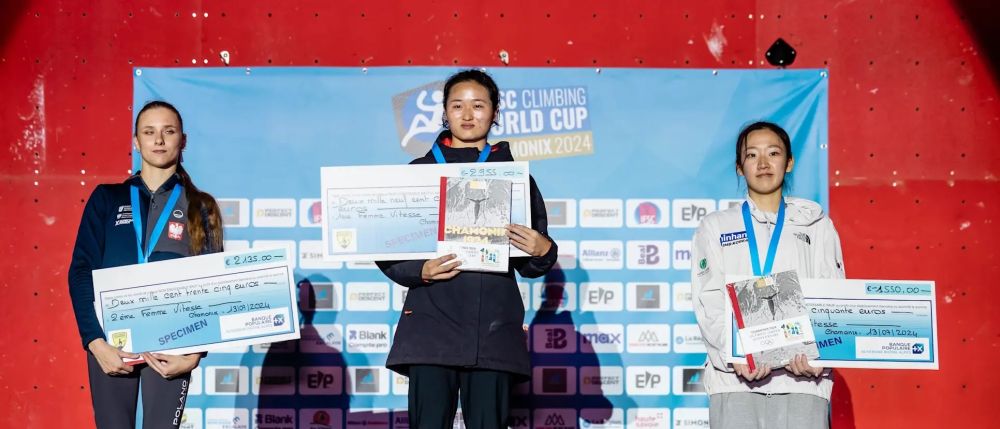 中国选手张少琴(中)在2024攀岩世界杯法国夏蒙尼站中获得女子速度项目冠军。图源:国际攀联官网