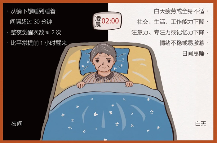 失眠是指尽管有合适的睡眠机会和睡眠环境,依然对睡眠时间和/或质量感到不满足,并且影响日间社会功能的一种主观体验。其主要症状为入睡困难、睡眠维持障碍、早醒、睡眠质量下降和总睡眠时间减少,同时伴有日间功能障碍。