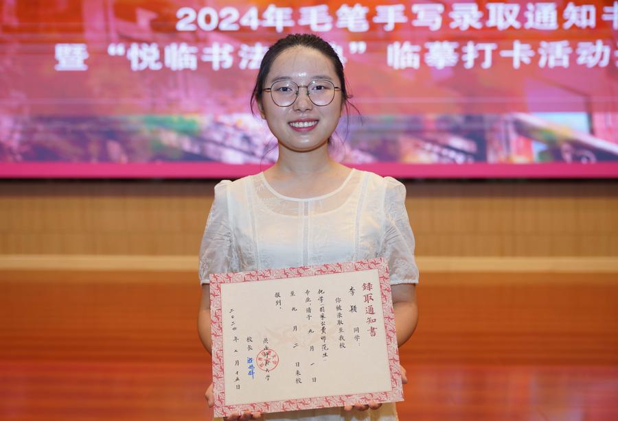 陕西师范大学2024级新生代表李颖展示录取通知书。新华社发