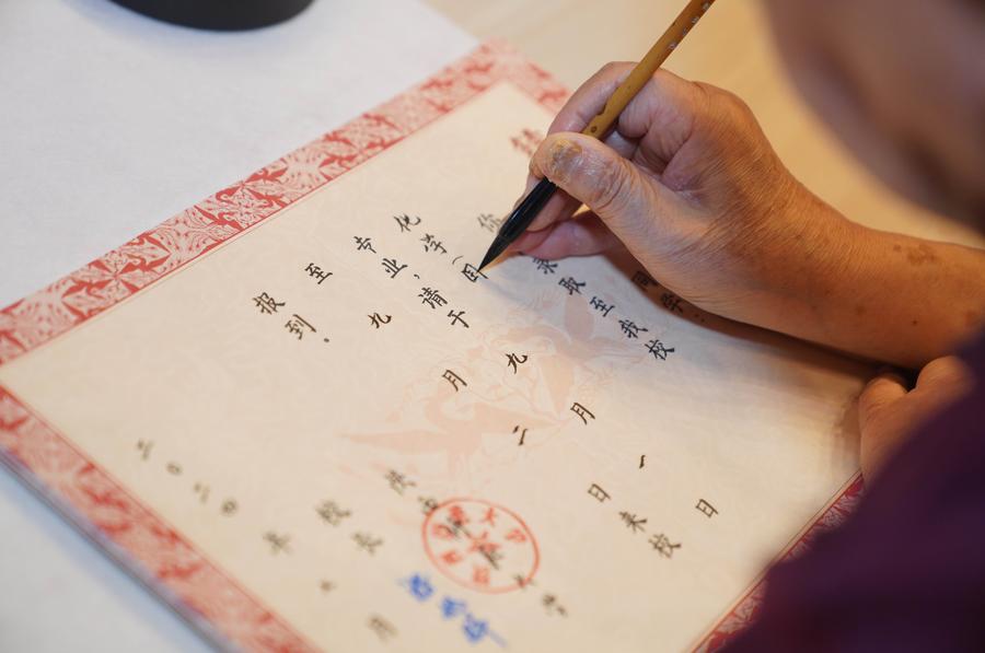 退休教师在陕西师范大学为新生手写录取通知书。新华社发