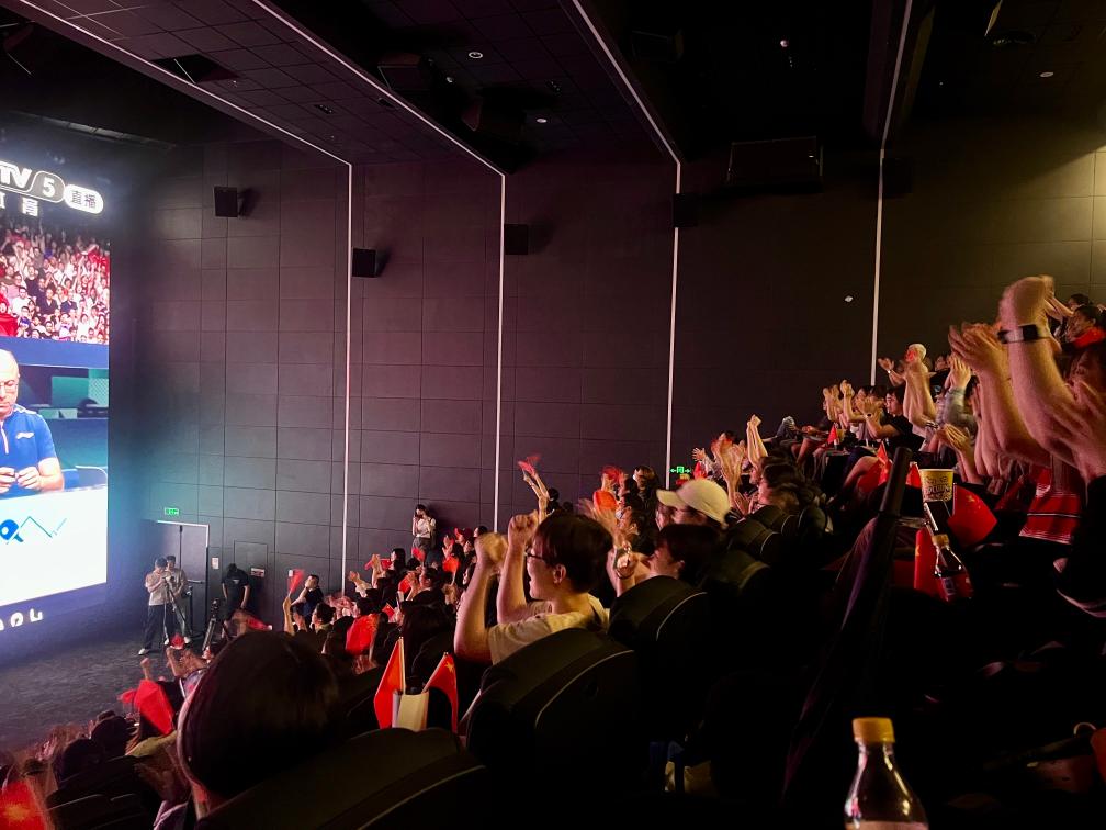 乒乓球混合双打决赛的影院观赛现场。(新华社记者马晓洁 摄)