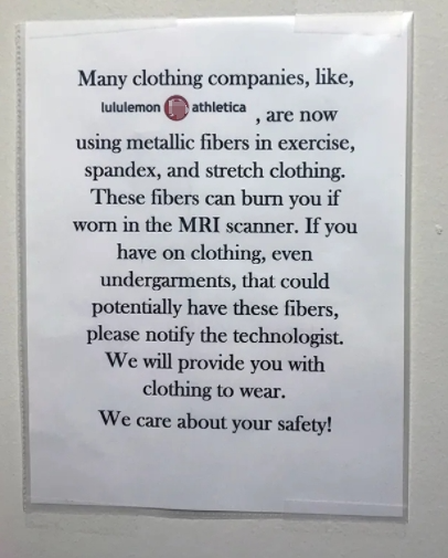 宾夕法尼亚州一家医疗机构的墙壁上贴有警示标志,告诫进来做核磁共振检查的人员最好别穿某品牌的瑜伽裤。