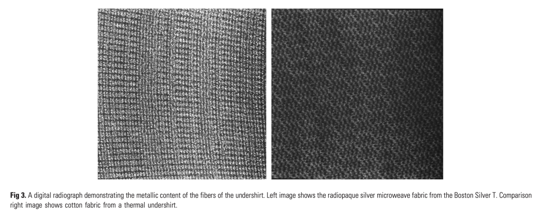 数字放射影像显示了波士顿银 T 恤的金属纤维含量,对比图显示了普通棉质内衣的放射影像 图源:文献