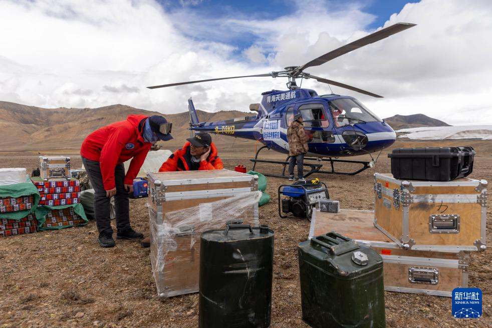 9月9日,徐柏青(中)和同事安排直升机将科考物资从海拔5400米的第二次青藏科考普若岗日冰原大本营运往海拔6100米的“Dome.C”点。