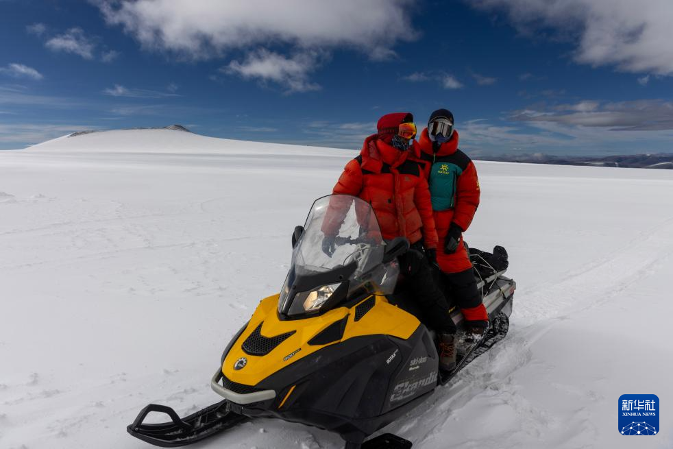 9月12日,科考队员在雪地摩托上商量前往其他作业点的路线。