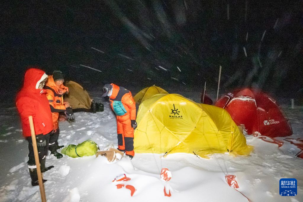 科考队员在夜间的大风雪中加固营地(9月11日摄)。