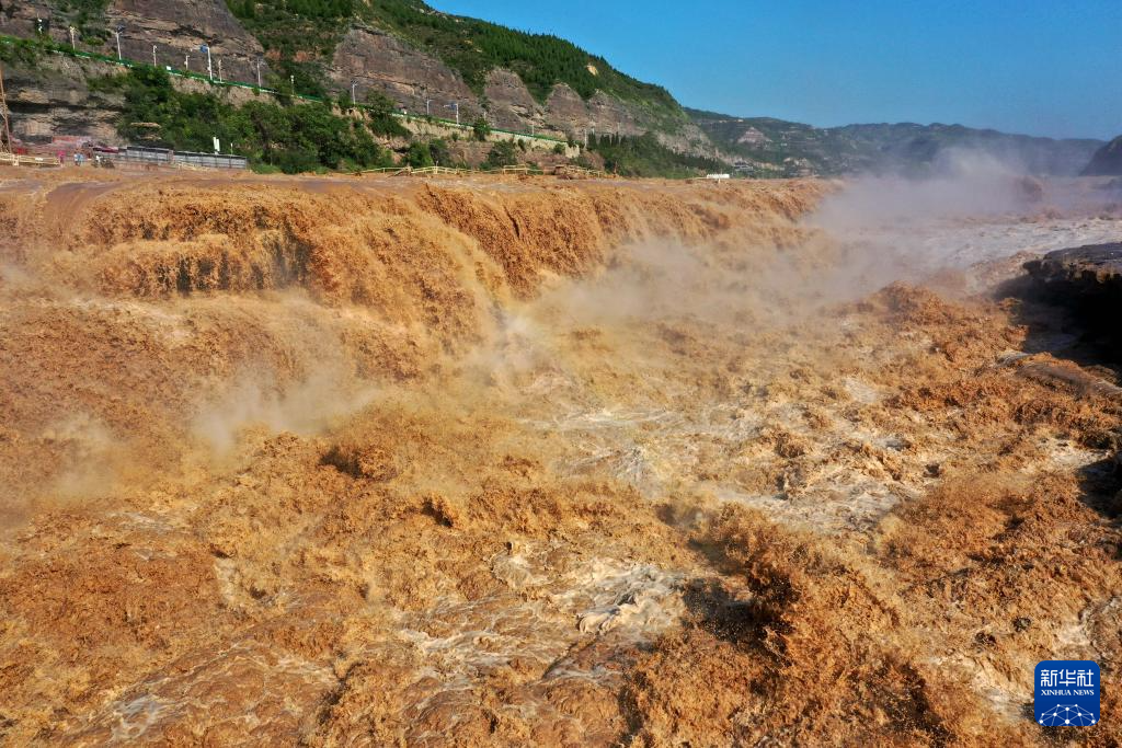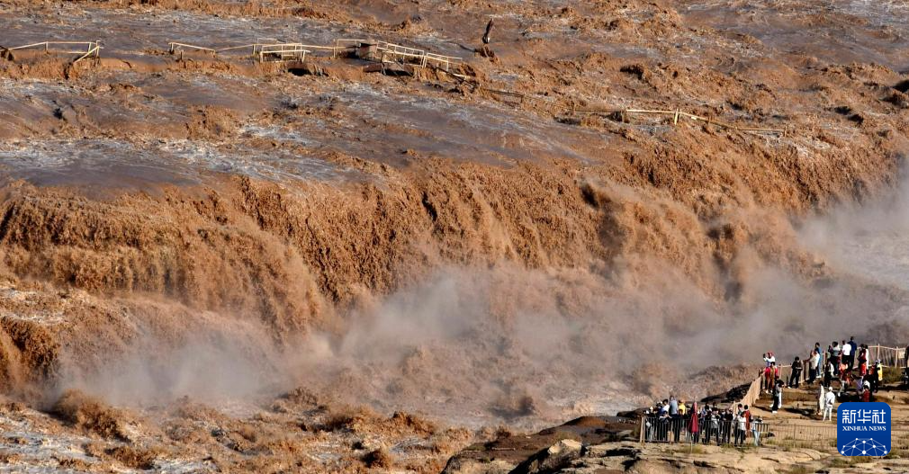 近日,受上游水库联合排沙影响,黄河干流水量大涨,滚滚黄河水裹挟着泥沙奔腾而下,位于山西吉县和陕西宜川县交界的壶口瀑布出现“金瀑飞流”景观,吸引众多游客。