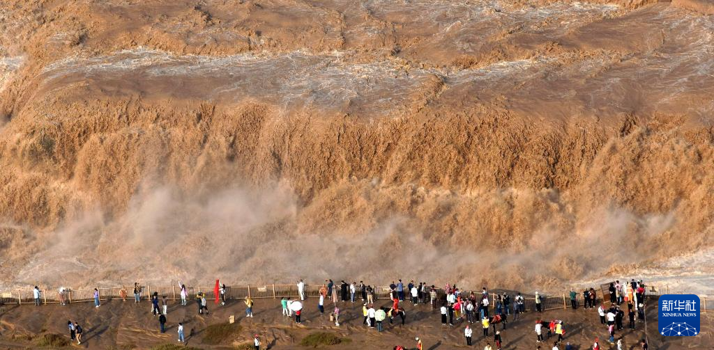 9月12日,游客在山西吉县黄河壶口瀑布欣赏“金瀑飞流”景观。