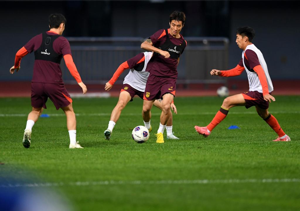 10月13日,中国国家男子足球队在青岛国信体育场进行赛前训练。新华社记者 李紫恒 摄