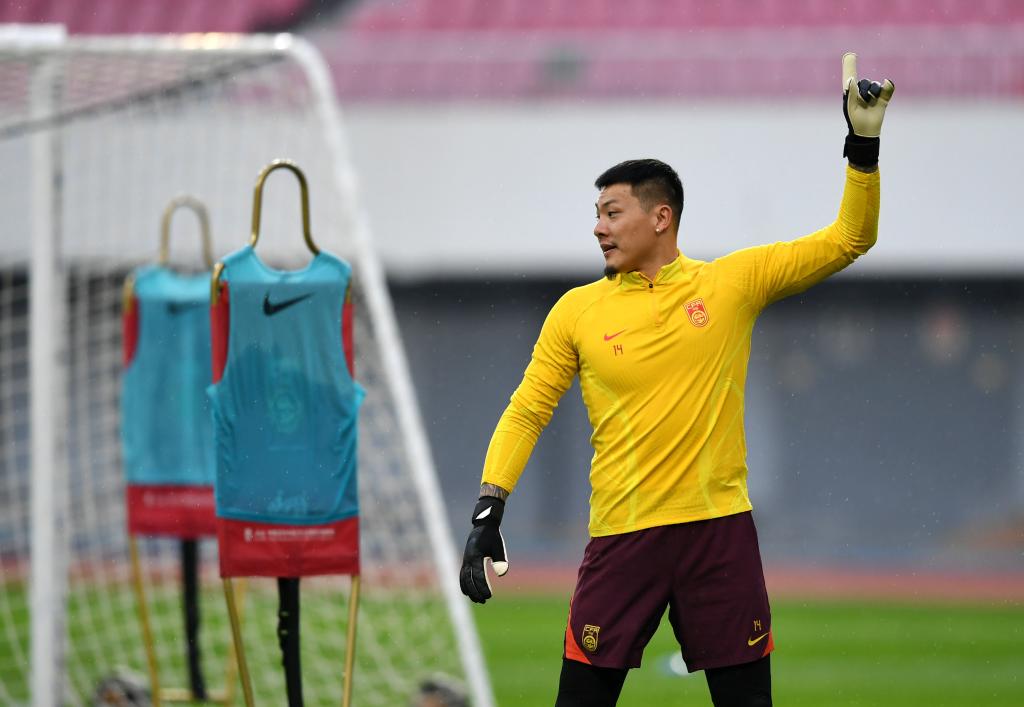 10月13日,中国队守门员王大雷在训练中。新华社记者 李紫恒 摄